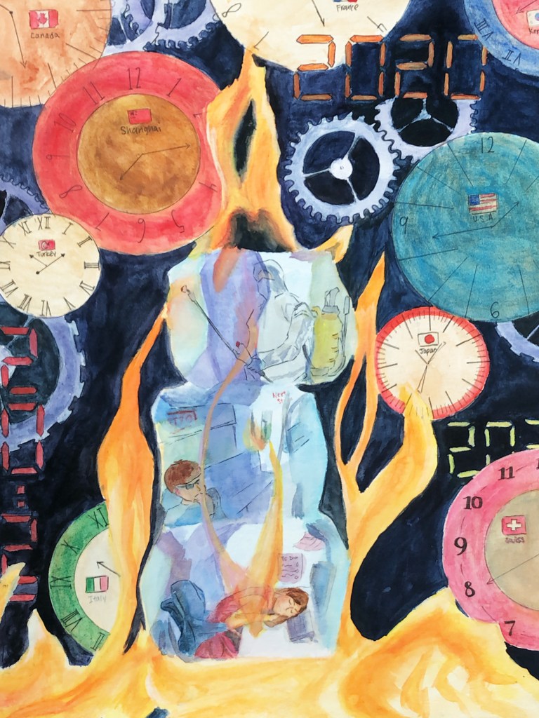 The clocks in the background represent different countries and how different countries have been handling the pandemic differently, either drawing out the pandemic or putting slowing it down which is why their times are all different.